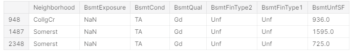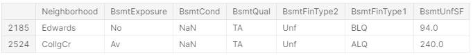 total[(total['BsmtUnfSF'].notnull()) & (total['BsmtUnfSF'] != 0) & (total['BsmtExposure'].isnull())][['Neighborhood', 'BsmtExposure', 'BsmtCond', 'BsmtQual', 'BsmtFinType2', 'BsmtFinType1', 'BsmtUnfSF']]