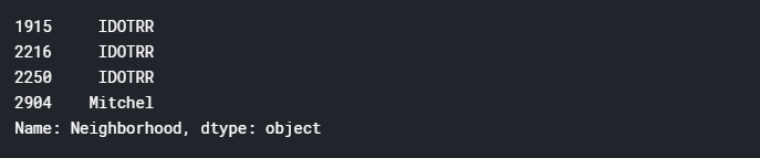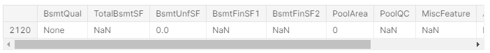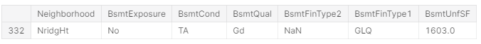 total.loc[i, 'BsmtExposure'] = total[(total['Neighborhood'] == A['Neighborhood']) & (total['MSZoning'] == A['MSZoning']) & (total['OverallQual'].isin([A['OverallQual']-1, A['OverallQual'], A['OverallQual']+1])) & (total['BsmtCond'] == 'TA') & (total['BsmtQual'] == 'Gd') & (total['BsmtFinType2'] == 'Unf') & (total['BsmtFinType1'] == 'Unf') & (total['BsmtUnfSF'] >= A['BsmtUnfSF']-125) & (total['BsmtUnfSF'] <= A['BsmtUnfSF']+125)]['BsmtExposure'].mode()[0]