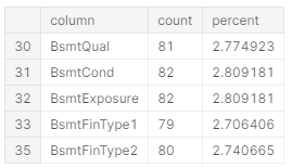 - 2.80% : BstmtExposure, BsmtCond, BsmtQual, BsmtFinType2, BsmtFinType1