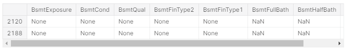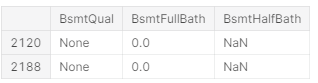 다음으로는 Bsmt와 관련된 결측치들에 대해 살펴보도록 하겠습니다. Bsmt는 basement를 의미하는 것으로 지하실을 의미합니다. basement도 Garage와 마찬가지로 결측치는 지하실이 없는 것을 의미합니다. Garage처럼 특이하게도 지하실이 없지만 다른 값들이 존재하는 경우가 있습니다.