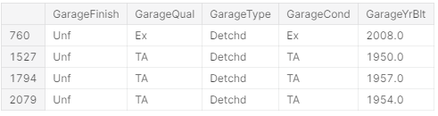 for col in ['GarageFinish', 'GarageQual', 'GarageType', 'GarageCond', 'GarageYrBlt']: