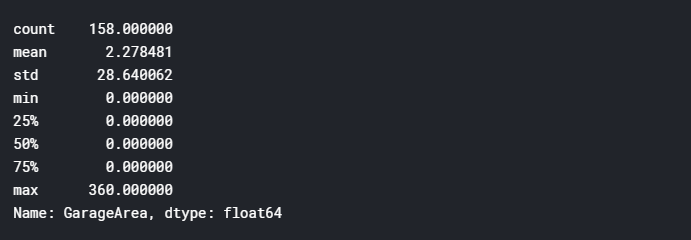 total[(total['GarageCars'].notnull()) & (total['GarageFinish'].isnull())][['GarageFinish', 'GarageQual', 'GarageCond', 'GarageYrBlt', 'GarageType', 'GarageCars', 'GarageArea']]['GarageArea'].describe()