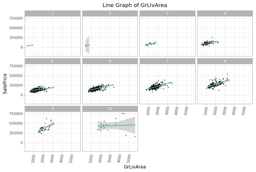 OverallQual이 높아짐에 따라 GrLivArea와 SalePrice 간의 상관관계가 높아지는 것을 볼 수 있습니다. 특이하게 OverallQual이 10인 경우에는 수평의 모습을 보이는데, 두 개의 이상치에 의해 그러한 결과가 나온 것으로 보입니다.