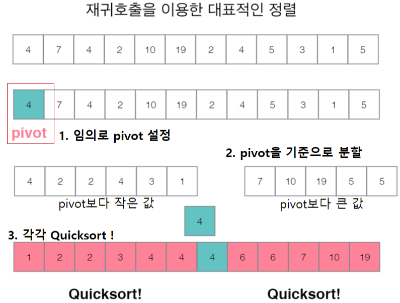# 4. 재귀호출로 left, right 각각에 대해 QuickSort진행
