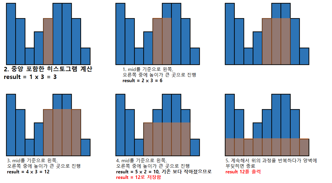 - 분할정복법 : 직사각형의 최대 넓이는 3가지의 경우에서 나옴
