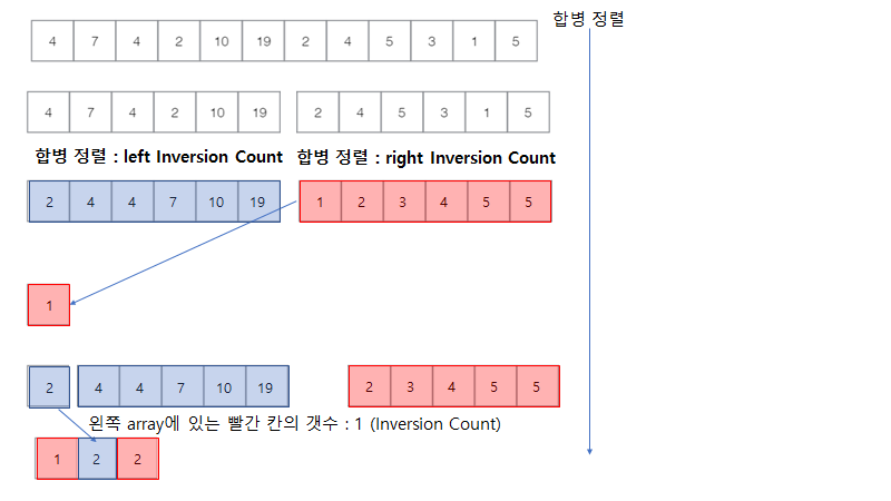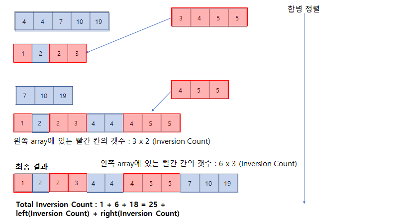- 합병정렬을 이용해가지고 합병정렬시에 순서가 바뀌는 카운트를 계산