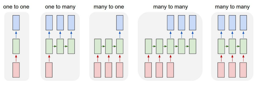 - one to many : 입력값은 하나고 출력은 여러 개 (예 : 하나의 입력 이미지에 문장이 나오는 경우, 자막 같은 경우)