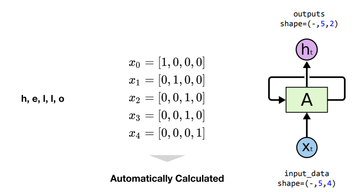 Cell A는 기본적으로는 함수연산입니다. 이전 단계의 출력 값과 지금 단계의 입력값으로 구성됩니다. 즉, $h_t = tanh(W_{hh}h_{t-1} + W_{xh}x_t + b_h)$ 입니다.