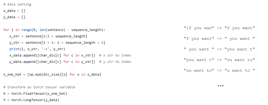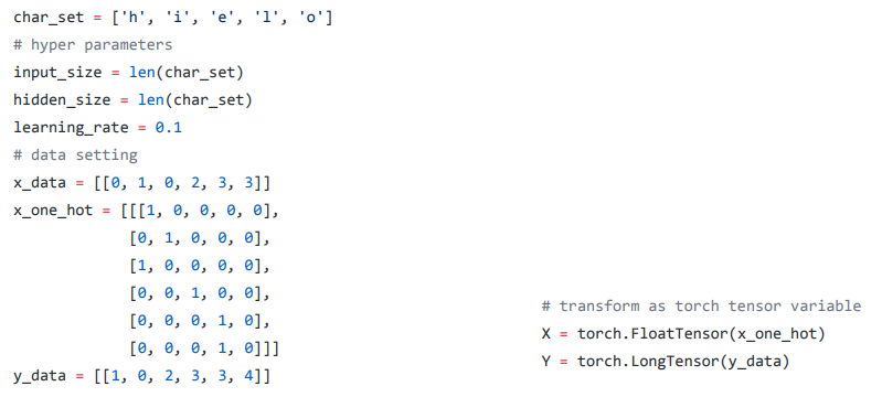 - 목적 : 다음에 오는 character를 예측해야 함 (h가 들어오면 i, i가 들어오면 h를 예측해야 함)