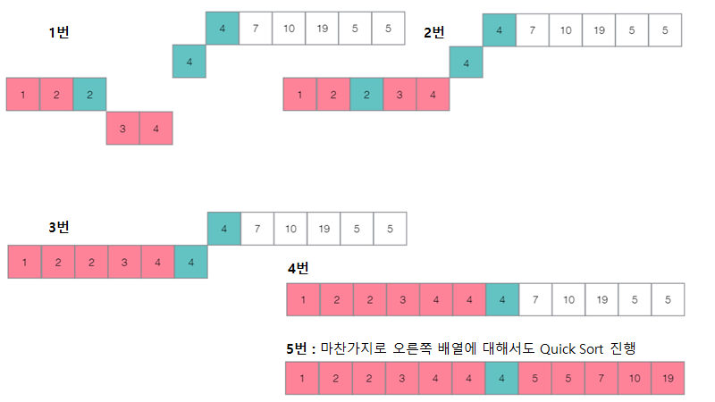 - 마찬가지로, 흰색의 3과 4의 경우도 재귀가 들어가서 정렬이 되게 되고 남은 과정도 재귀 호출이 진행되면서 자연스럽게 정렬이 되게 된다.