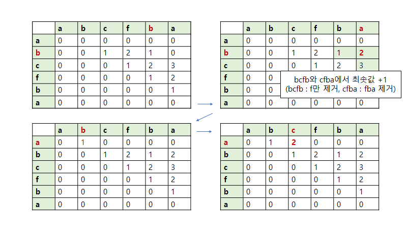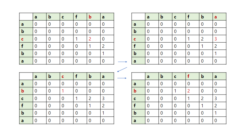 - 예 : abcfb은 abcf와 bcfb중에서 최솟값에 1을 더하기