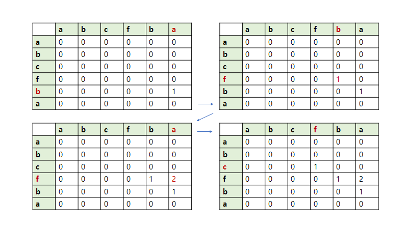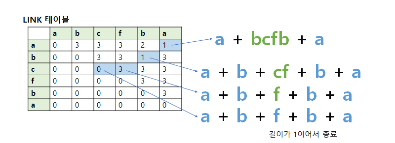 - abcfb은 abcf와 bcfb중에서 최솟값인 경우를 기록