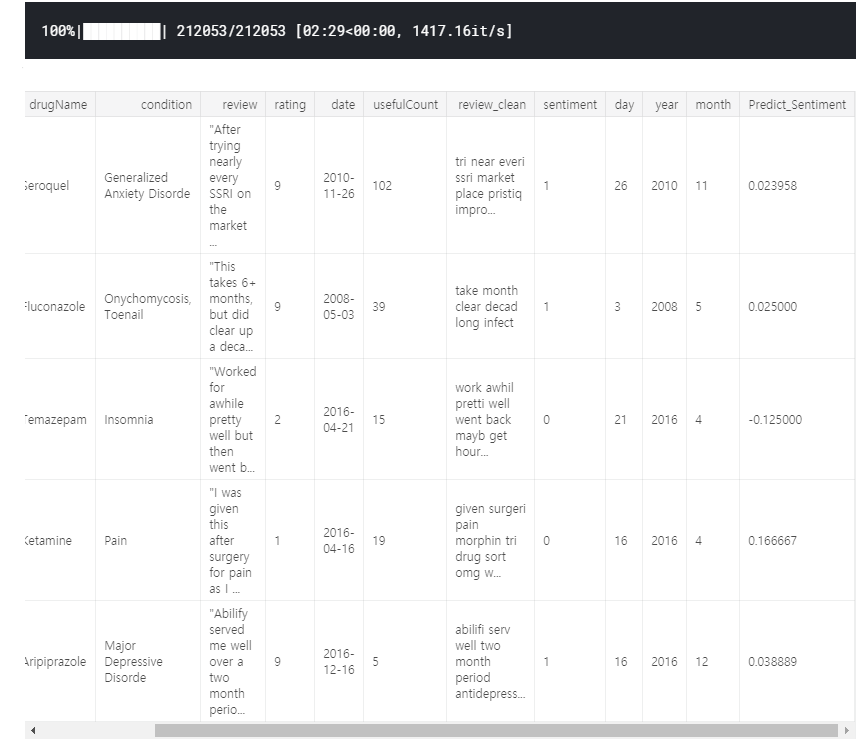 앞에서 언급했듯이 usefulCount는 조건에 따라 바이어스를 나타내는 문제를 해결하기 위해 usefulCount를 조건별로 정규화했습니다. 그런 다음 세 개의 예측 감정 값을 추가하고 정규화 된 usefulCount를 곱하여 예측 값을 얻을 수 있습니다.
