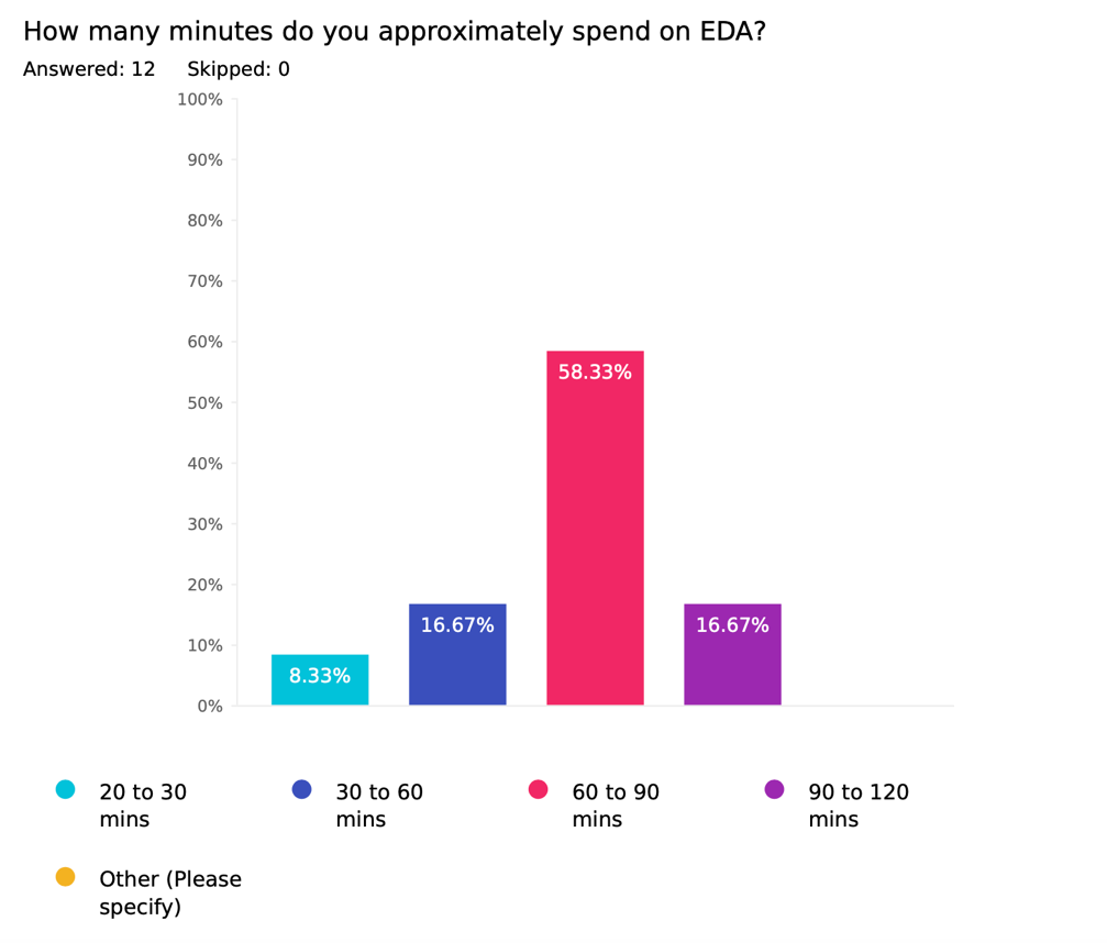 여기서 볼 수 있듯이, 대부분의 사람들은 평균적으로 EDA에 약 1시간 30분을 소비합니다. 이 결과는 EDA 프로세스 속도를 높이기 위한 도구가 필요하다는 사실을 입증합니다.