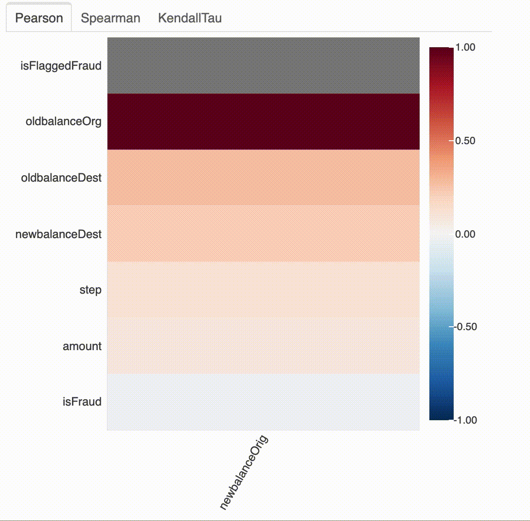 # 지정된 요소와 다른 모든 속성의 상관관계 (즉, newbalanceOrig 과 다른 변수들 간의 상관관계)