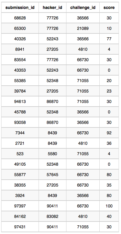 Submissions:Thesubmission_idis the id of the submission,hacker_idis the id of the hacker who made the submission,challenge_idis the id of the challenge that the submission belongs to, andscoreis the score of the submission.