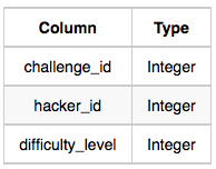 Challenges:Thechallenge_idis the id of the challenge, thehacker_idis the id of the hacker who created the challenge, anddifficulty_levelis the level of difficulty of the challenge.