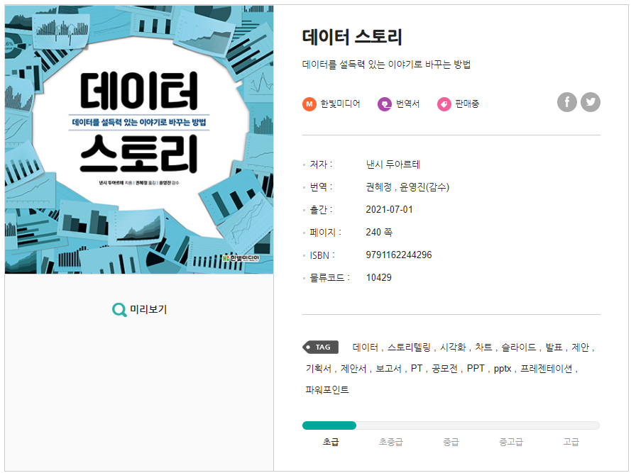 기존의 많은 책들은 "데이터 분석"에 초점을 맞추었다면 이 책은 "스토리 텔링"에 맞추어져 있습니다. 데이터 분석 공모전을 하면서 항상 느끼는 점은 내가 분석한 내용을 어떻게 설명을 해야할지 였습니다. 같은 데이터를 가지고 분석한 팀원들에게도 내가 한 분석을 설명하기 어려운데 심사위원들에게 이를 어떻게 설명하고 이해시킬지 막막하기만 합니다. 안그래도 최근에 이러한 고민을 많이하게 되었고 7월 리뷰로 해당 책을 선택하게 되었습니다.