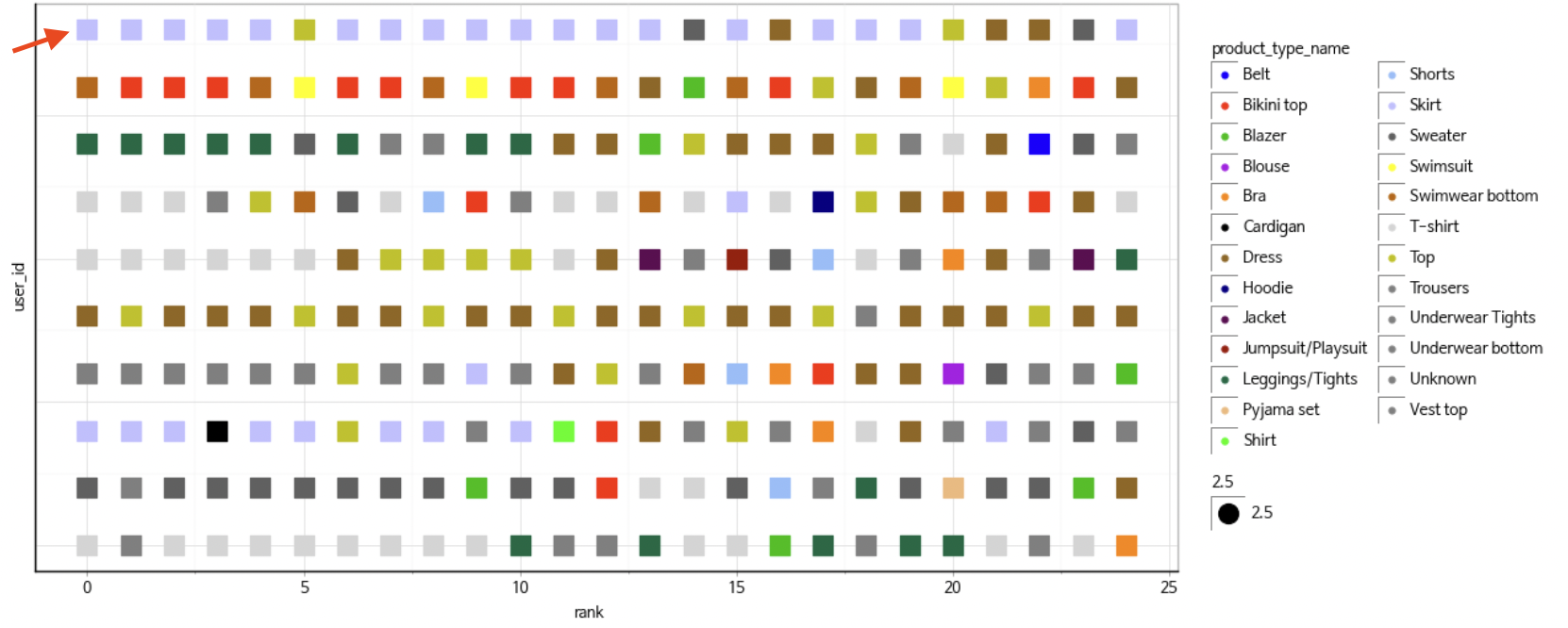한번 위의 내용들을 바탕으로 실제 캐글의 H&M 데이터에 대해서 어떤 식으로 추천 결과가 바뀌는지 적용해 보도록 하겠습니다. 먼저 임의의 유저에 대해서 ALS로 학습한 모델이 어떤 추천 결과를 뱉는지 살펴보겠습니다.