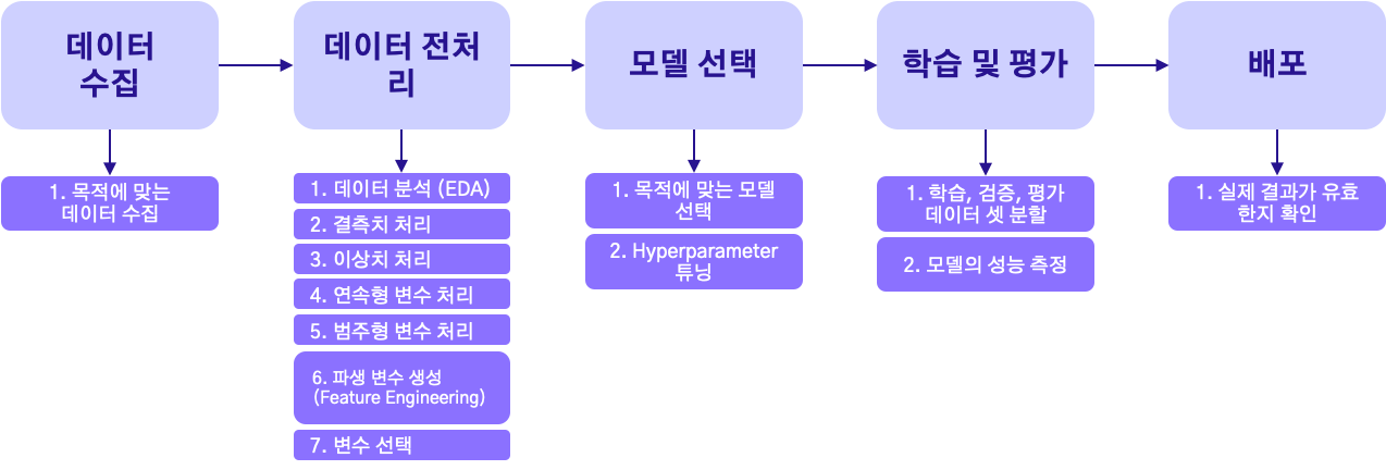 강의에서는 데이터 수집과 배포를 제외한 데이터 전처리, 모델 선택, 학습 및 평가에 대해 순차적으로 살펴볼 계획이며 특히, 보라색으로 칠한 부분에 중점적으로 살펴볼 계획입니다.