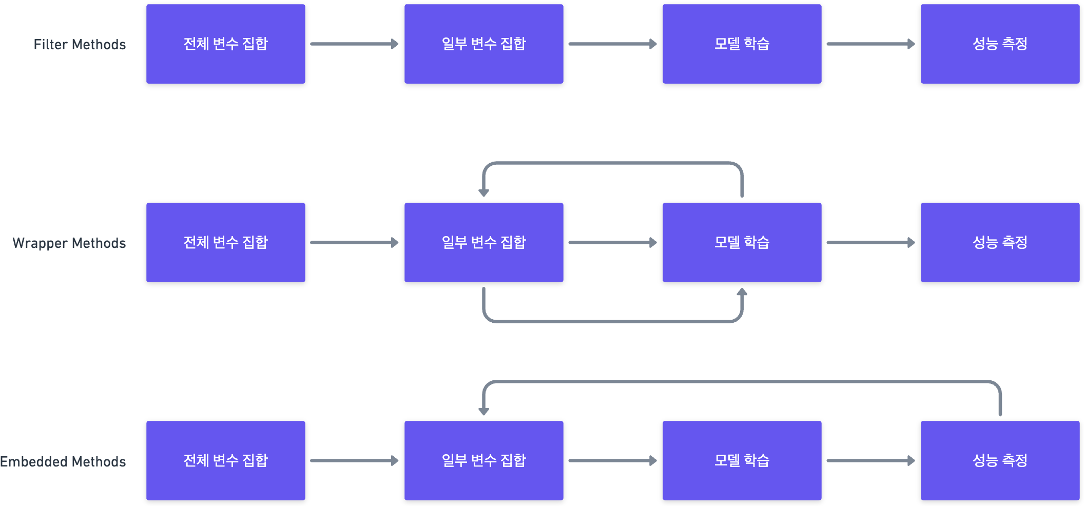 마지막으로, 기존의 변수들과 새로 만든 파생변수들 중 의미가 없는 변수들을 버리고 유의미한 변수만을 남기는 변수 선택(Feature Selection)의 과정을 거치게 됩니다. 변수선택은 모델의 학습을 하기 전 일부 변수만을 추출하는 방법으로 성능적인 측면에서는 오버피팅을 피하면서 차원의 저주를 줄이기 위해 사용되고 비용적인 측면에서는 변수의 수집비용을 줄이며, 추론 속도를 빠르게 도와줍니다. 해당 강의에서는 전통적으로 많이 사용하는 3가지 방법인 Filter / Wrapper / Embedded 3가지에 대해 먼저 살펴보고 캐글에서 많이 사용하는 Permutation Importance / Adversarial Validation / Null Importance 3가지에 대해 순차적으로 살펴보겠습니다.