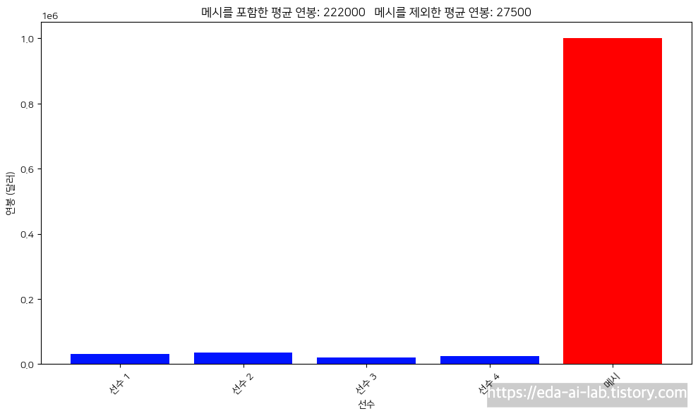 이상치(outlier)는 일반적인 데이터 패턴에서 벗어나거나 예외적인 값을 가지는 데이터 포인트를 의미합니다. 이러한 이상치는 주로 측정 오류, 혹은 특이한 상황 등으로 인해 발생하는 값입니다. 이러한 이상치는 통계적 결과를 왜곡 하는 원인이 되기도 하고, 모델의 학습을 방해하는 요소이기도 원인을 파악하고 원인에 따른 처리를 하는게 중요합니다. 예를들어, 위의 그래프처럼 축구선수의 평균연봉은 222000으로 크게 느껴지지만, 메시라는 선수 한명을 제외하면 10배 가까이 확 낮아지는 것을 볼 수 있습니다. 그렇기에, 이런 이상치 하나가 통계적인 결과를 많이 왜곡하는 결과를 가져옵니다.