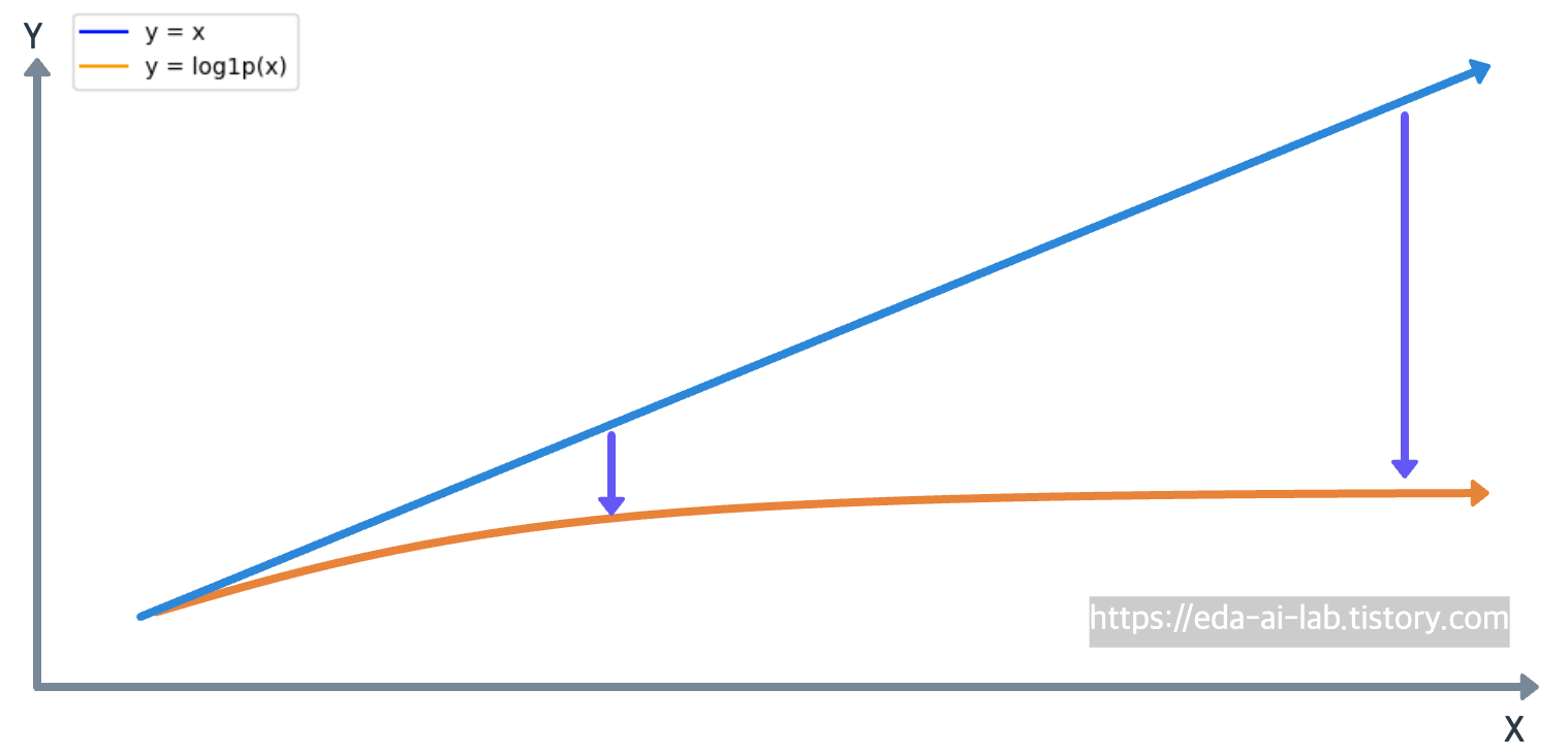 로그 변환의 경우 큰 값은 더 작게, 작은 값은 조금 작게 바꾸는 효과가 있습니다. 그렇기에, 만일 이상치가 크게 생기는 경우 그 값을 작게만들어서 y = x 일때의 차이보다 y = log1p(x) 일때 차이가 적어져서 이상치의 효과가 작아지는 효과가 있습니다. (이상치가 많은 경우에 이런 방법을 적용하면 효과가 있고, 경험상 Transformer을 사용할때 가격같은 변수에 대해 이러한 방법을 많이 적용합니다. 이상치의 대체 목적도 있지만 가격이 변화 차이가 작은 폭에서 변화가 큰 폭에서의 변화보다 크게 느껴지게에 그런 효과를 반영해주기 위함도 있습니다.)