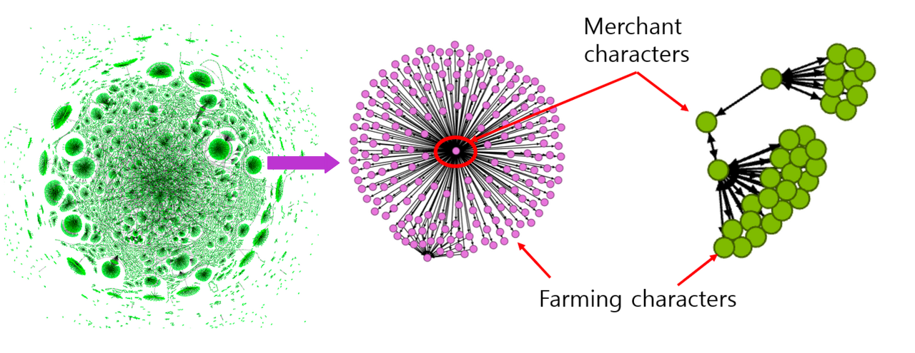 마지막으로, 집단적 이상치가 있습니다. 집단적 이상치는 데이터 분포에서 집단적으로 편차가 이탈되어 이상치로 간주하는 부분으로 관측치 개별로 보았을 때는 이상치처럼 보이지 않지만, 집단으로 봤을때는 이상치처럼 보이는 것이 특징입니다. 대표적인 예시로 게임에서 "작업장 (golf-farming group)" 같은 경우를 생각해볼 수 있습니다. 그래프를 보면 수백개의 캐릭터들이 한개의 캐릭터 (Merchant)를 중심으로 선이 뻗어나가는 것을 볼 수 있습니다. 즉, 전체 유저 중에서 특정한 목적을 가지고 작업장을 운영하는 집단이 일반 유저와 다른 모습을 보이고 이러한 경우를 집단적 이상치라고 합니다.