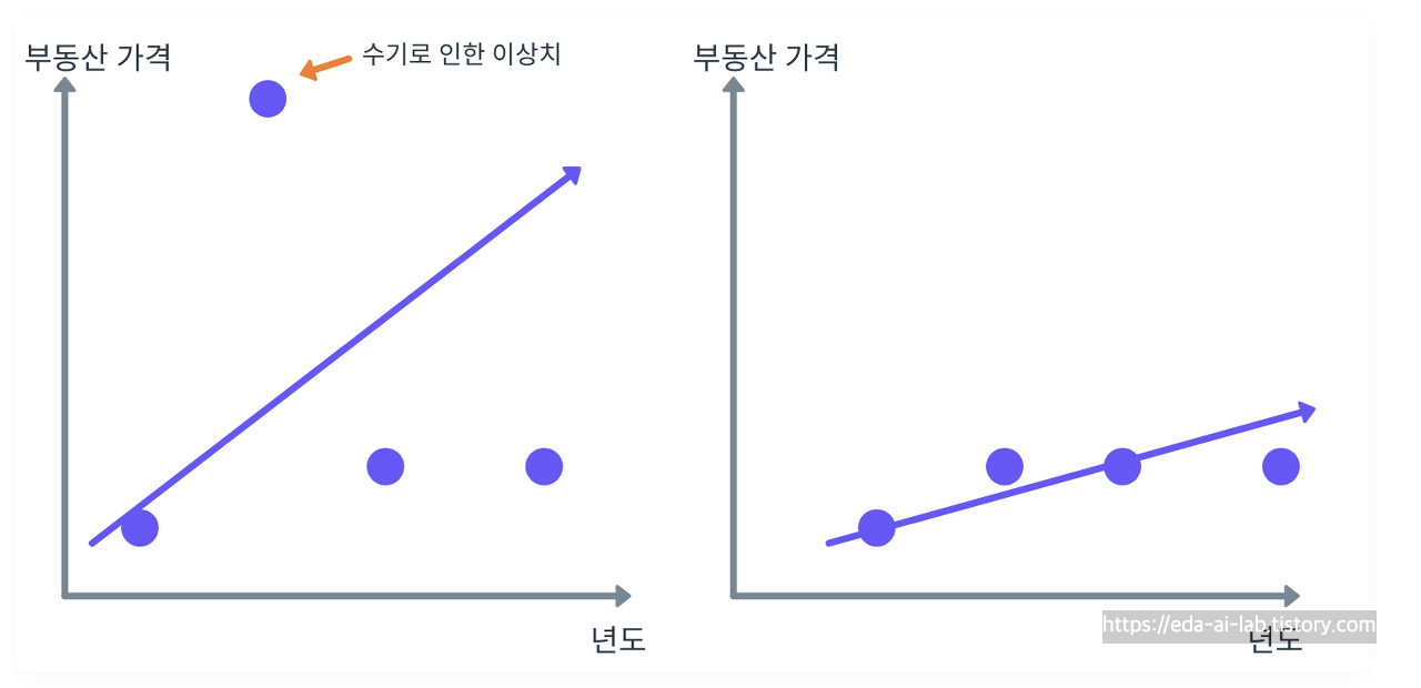 1. 모델의 안정성 향상 : 이상치에 의해 특정 모델의 학습을 방해하거나 예측 결과를 왜곡시킬 수 있습니다. 대표적으로 선형 회귀 모델이나 KNN 같은 경우 이상치의 영향을 받기가 쉽습니다. 해당 모델들이 이상치에 영향을 받는 부분은 [Machine Learning Advanced] 5강. 머신러닝 강의 - 기본 ML 모델 (선형 모델)와 [Machine Learning Advanced] 5강. 머신러닝 강의 - 기본 ML 모델 (KNN)의 글에서 참고하시기 바랍니다. 간단하게 아래의 그래프만 봐도 왼쪽의 이상치 하나에 의해 선형회귀선이 많이 달라지는 것을 볼 수 있습니다.