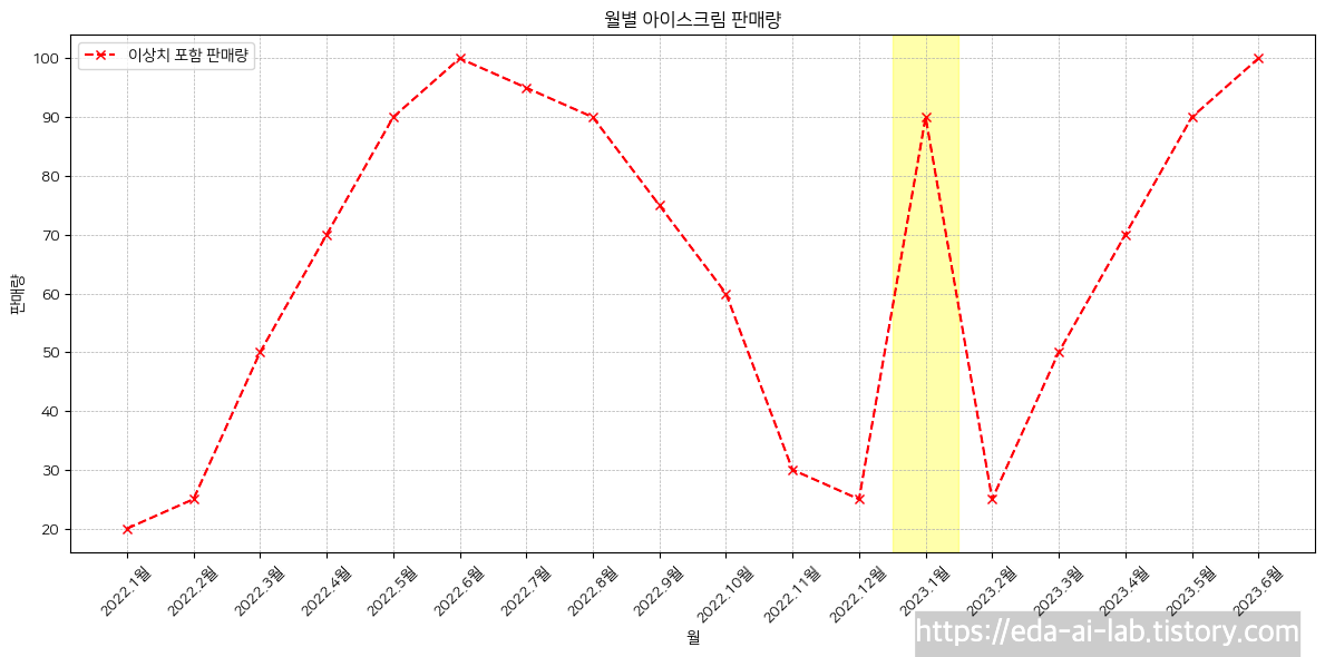 둘째, 상황적 이상치는 특정 상황에서만 이상치로 간주되는 데이터 포인트를 의미합니다. 동일한 데이터 포인트가 다른 상황에서는 이상치가 아닐 수 있습니다. 예를들어, 아이스크림의 경우 당연하게 여름에 많이 팔리고 겨울에는 적게 팔립니다. 근데 2023.1월처럼 겨울에 많이 팔리는 경우 90만개라는 판매량 자체가 이상한 값은 아니지만, 겨울이라는 상황에서는 이상한 값으로 간주됩니다.