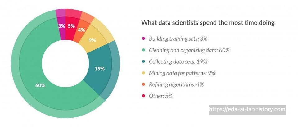 실제로, 2016년도 조사에 따르면 이러한 데이터 전처리나 구축하는 부분은 총 시간의 60%를 차지할만큼 많은 투자를 해야한다고 합니다. 제 경험상 데이터 결측치나 이상치 처리에는 그렇게 많은 시간을 쓰는 것 같지는 않지만, 데이터를 분석(EDA)하고 파생 변수를 만드는 과정에 상당한 시간이 쓰이는 것 같습니다.