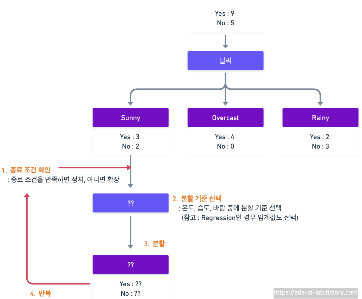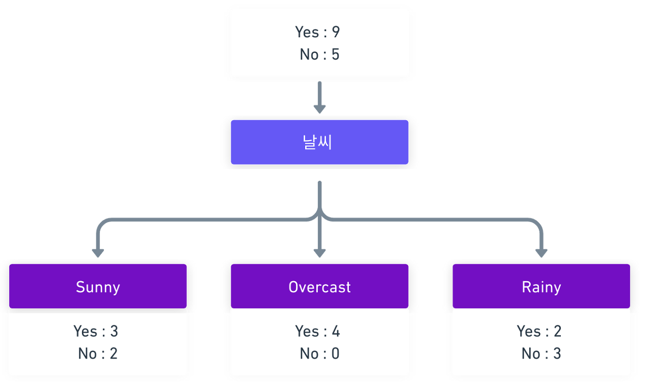Sunny - Overcast - Rainy에 대해서 1번부터 과정을 반복합니다. Overcast는 종료조건을 만족했기에 분할을 멈추고, Sunny와 Rainy에 대해서 다시 분할을 진행하게 됩니다.