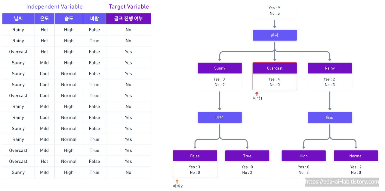 이러한 의사결정 나무는 직관적인 해석이 가장 큰 장점입니다. 날씨, 온도, 습도, 바람이라는 4개의 독립 변수를 가지고 골프 진행 여부라는 종속 변수를 맞추는 문제가 있을때 이를 통해 만들어진 오른쪽 의사결정 나무를 한번 봐보겠습니다. 이때, 위의 그림에서 박스친 부분의 해석은 아래와 같이 할 수 있습니다.