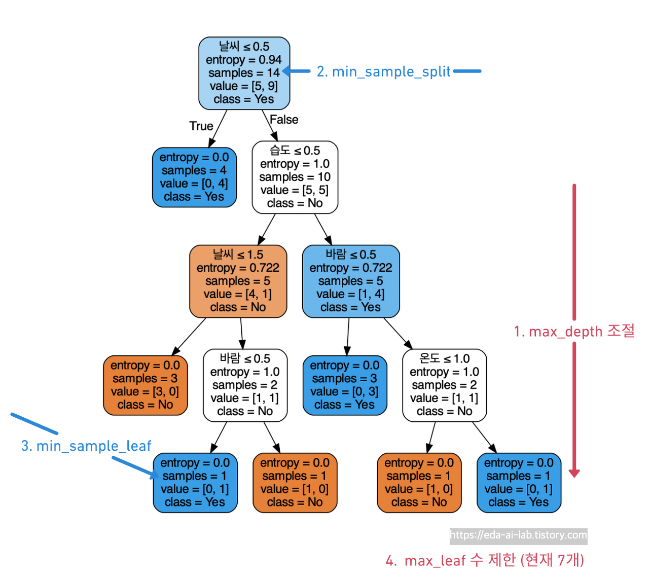 트리의 최대 깊이를 제한하여 트리가 더 깊어지지 않도록 합니다. 계속 깊어질 수록 조건이 많아진다는 의미이니 과적합 가능성이 높기에 max_depth의 크기를 줄일 수록 과적합을 피할 수 있습니다.