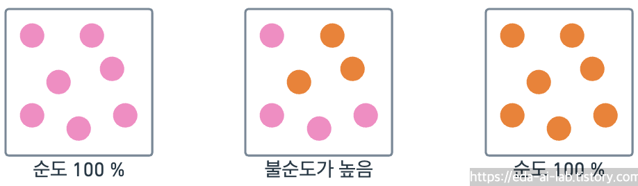 분할의 종료조건이란 무엇일까요? 의사결정나무는 불순도(Impurity)를 최소화하는 방향으로 학습합니다. 불순도는 단어 그대로의 뜻으로 얼마나 섞여있냐는 의미입니다. 반대되는 용어로 순수하다라는 의미가 있습니다. 아래의 예시를 보면 알겠지만, 분홍색으로만 혹은 주황색으로만 있는 1, 3번의 경우가 순도가 100%으로 불순하지 않고, 반대로 2번 경우가 분홍색과 주황색이 섞여서 불순도가 높다고 합니다.