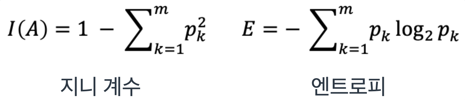 이런 불순도는 머신러닝 분야에서는 2가지 지표인 지니 계수 (Gini coefficient)와 엔트로피(Entropy) 두가지로 측정할 수 있습니다.