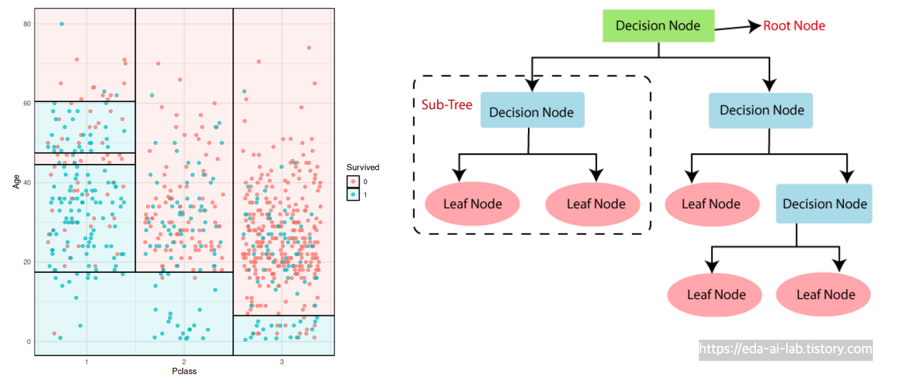 와 같이 변수들의 조합을 통해서 해석을 할 수 있습니다. 이렇게 되게 트리가 분기되는 과정을 시각적으로 표현할 수 있기에, 직관적으로 패턴을 파악하기 쉽습니다. 그리고, 위에서는 독립변수와 종속변수 모두 범주형 데이터에 대해서 보여줬지만 연속형 변수로 바뀌어도 상관없이 처리할 수 있다는 장점이 있습니다. 마지막으로, 선형 회귀 모델과 다르게 비선형적인 특성을 파악할 수 있고 다중 공선성 등 여러가지 가설들을 고려하지 않아도 된다는 장점이 있습니다.