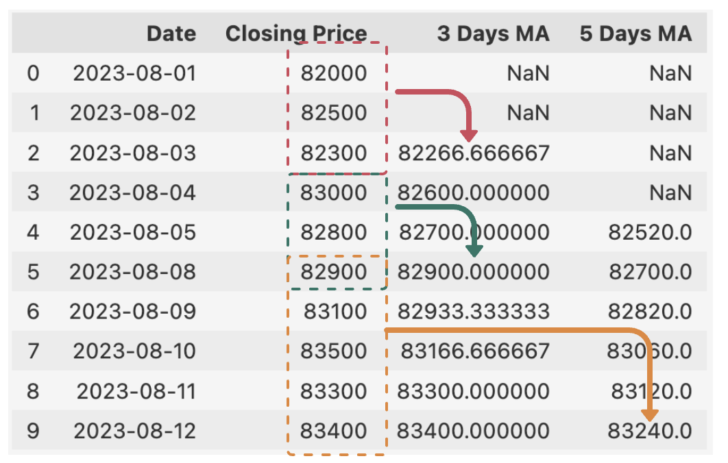 보통 주식 시장에서 주가의 흐름을 부드럽게 표현하거나 주가의 추세를 파악하는 데 일반적으로 사용되는 방법입니다. 예를 들어, 3일 이동평균은 최근 3일 동안의 종가를 평균한 값입니다. 마찬가지로, 5일 이동평균은 최근 5일 동안의 종가를 평균해서 계산합니다.
