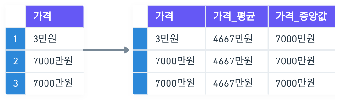 위의 부분에 공통적으로 사용할 수 있는 부분으로 결측치의 유무를 파생변수로 만드는 방법이 있습니다. 예를들어, 결측치가 있으면 1 없으면 0의 값을 부여하는 새로운 변수를 만드는 것입니다. 그 외에 많이 사용하는 방법으로는 통계적인 의미를 만드는 변수를 추가할 수도 있습니다. 예를들어, 위의 카드사의 거래내용 데이터에서 가격 변수를 기반으로 통계적 변수인 평균, 편차, 중앙값 등의 변수를 만들 수 있습니다. (평균 = (3+7000+7000)/3)