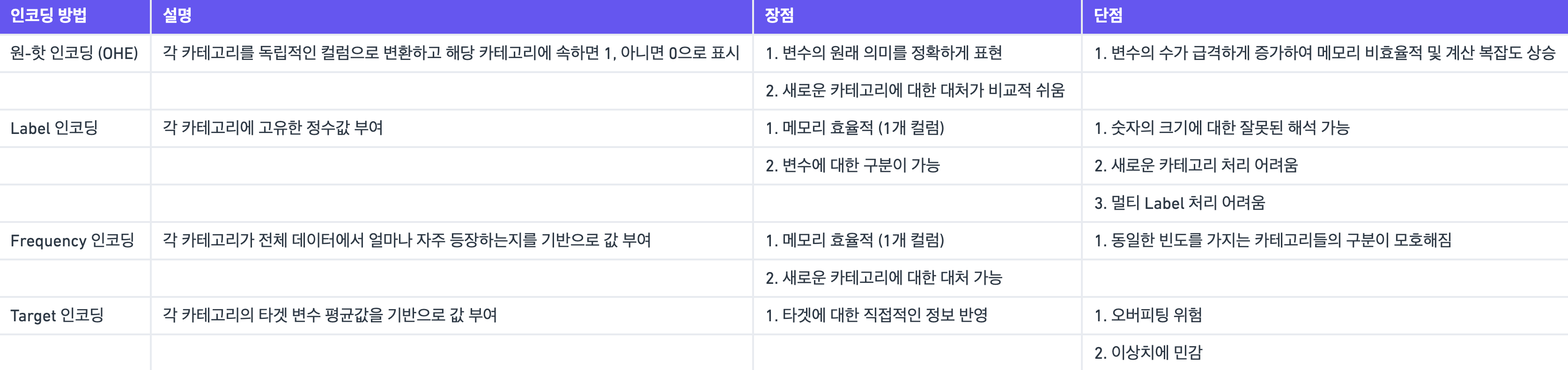 2강에서 살펴본 [Machine Learning Advanced] 2강. 머신러닝 강의 - 데이터 전처리 (변수의 인코딩, 임베딩 방법) 내용이 해당 부분과 연관이 있습니다. 해당 글에서는 범주형 변수를 처리하는 방법으로 One Hot Encoding, Label Encoding, Frequency Encoding, Mean Encoding에 대해 살펴봤습니다.