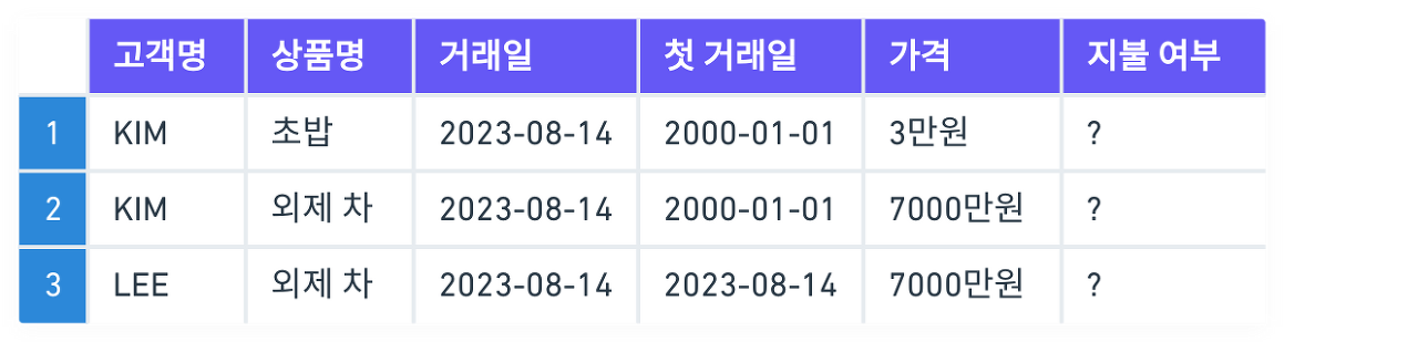 수치형 변수의 상호작용이 아닌, 날짜형 변수의 상호작용을 보겠습니다. 이전에 봤던 예시 데이터인 카드사의 거래내용을 기반으로 지불 여부를 예측하는 데이터를 다시 보겠습니다. 실제 해당 고객이 카드값을 지불할 능력이 있는지 거래일과 첫 거래일을 따로따로 보면 모델을 이를 판단하기 어렵습니다. 이런경우, 거래일에서 첫 거래일을 빼서만든 "거래한 기간"을 보면 유재석의 경우 8626일 동안 거래를 지속함에도 지불을 안한 경우가 없다면 모델을 지불할 능력이 충분하다라고 판단하기 쉽습니다. 반대로, 김종국의 경우 0일 동안 거래를 한 사람이니 모델입장에서는 이를 지불할 능력이 있다고 판단하기 어려울 것입니다.