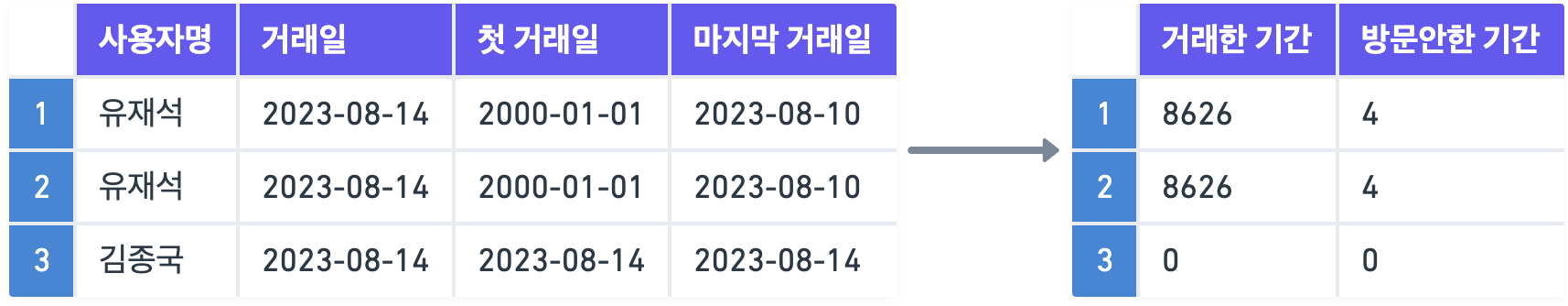 특정 시점을 기준으로 해당 시점과의 차이를 만들 수도 있습니다. 예를들어, 위에서는 거래일을 인식해주기 위해서 '1900-01-01'과 같은 특정 시점으로부터의 차이 (거래일 - '1900-01-01')로 변수를 만들 수 있고 혹은 첫 거래일이라는 고객명에 종속되는 변수를 이용해서 거래일 - 첫 거래일로 변수를 만들 수도 있습니다.