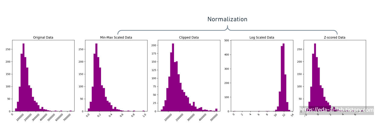 대표적으로 Min-Max Scaling이라고 불리는 방법론이 있으며 딥러닝에서 입력을 전처리할때 많이 활용되며 KNN과 같은 모델의 스케일을 조정해줄때 사용할 수 있습니다. 단, Min-Max scaling은 실제 원본 데이터와 분포의 모습을 동일하게 유지하면서 범위를 조정하기에 이상치에 취약한 모습을 보이기도 합니다.