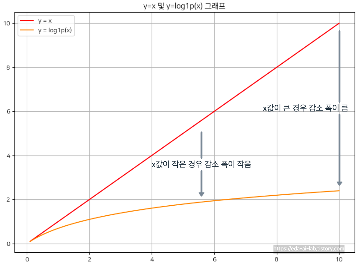 x의 크기가 커질 수록 감소 폭 또한 커지는 것을 생각할 수 있습니다. 그로인해 "상품의 가격", "집 값" 등 0부터 시작해서 우측으로 가격이 치우치는 모습을 보이는 연속형 변수에 적용했을때 좋은 모습을 보였던 경험이 있습니다. 하지만, log1p가 아닌 log를 취하게 될 경우 0~1 사이의 값은 오히려 커질 수가 있습니다. 그 외에도 Rank transformation 같은 방법도 존재하고 이상치가 있을때 MinMaxScaling보다 훨씬 좋은 모습을 보입니다.