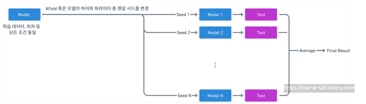 SEED 앙상블은 다른 조건은 모두 고정한채로 KFold 혹은 모델의 하이퍼 파라미터 중 랜덤 시드만을 변경해서 결과를 생성하는 방법을 의미합니다. 시드의 고정 파트에서 언급한 것처럼 시드가 달라지게 되면 결과의 변동성이 발생하게 됩니다. 그렇기에, 의도적으로 시드를 여러번 교체해서 다양성을 만들고 이를 앙상블하여 최종 결과의 분산을 줄이게 만드는 방법입니다. 실제 대회에서는 Public 리더보드는 알지만 Private 리더보드는 모르기에 시드 앙상블을 통해 최대한 안정성을 보장하려는 시도를 많이합니다. 다만, bias and variance의 관계와 같이 variance가 낮아지면서 bias 또한 낮아지는 것은 쉽지 않습니다. 그렇기에, 시드 앙상블을 통해 안정성은 보장해도 성능 자체는 떨어지는 경험을 많이 했던 것 같습니다.