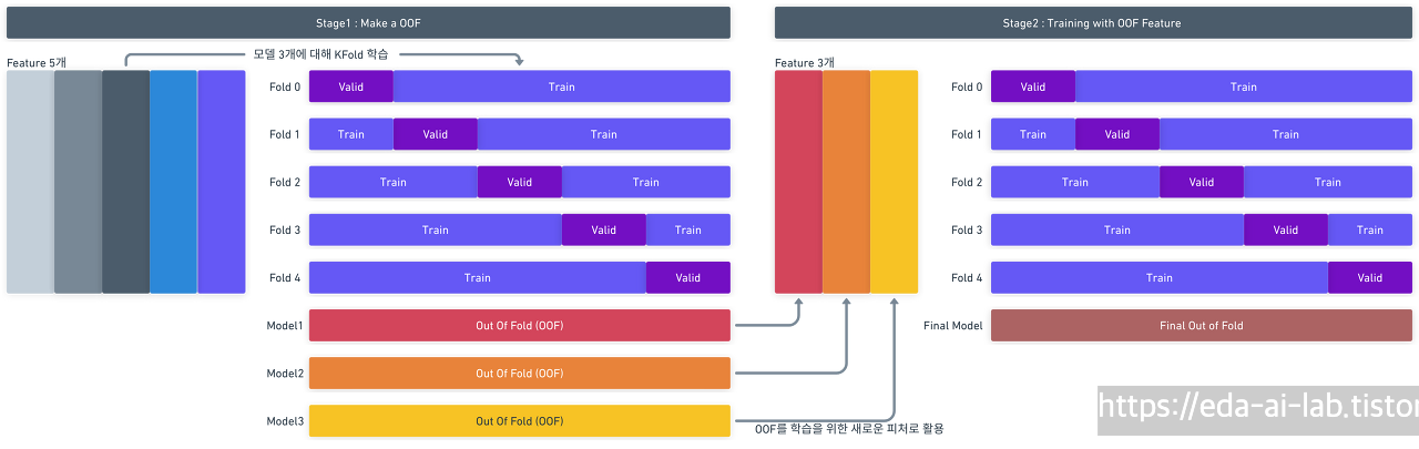 위와는 반대로 Stacking이라는 방법도 있습니다. Stacking은 OOF를 모아서 파생변수로 활용해 새로운 모델을 예측하는 방법입니다. [Stage1] 이전에 모델 앙상블 파트에서 본 것 처럼 XGBoost, LightGBM, Catboost 등을 통해 다양한 OOF를 수집할 수 있습니다. [Stage2] 그리고, 이런 OOF들만을 변수로 활용 (혹은, 기존 5개의 Feature + 3개의 OOF Feature)을 하여 새로운 모델을 학습하여 최종 모델을 내는 방법입니다.