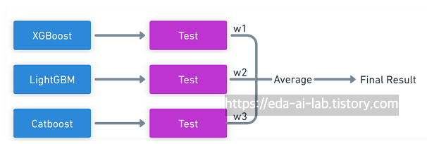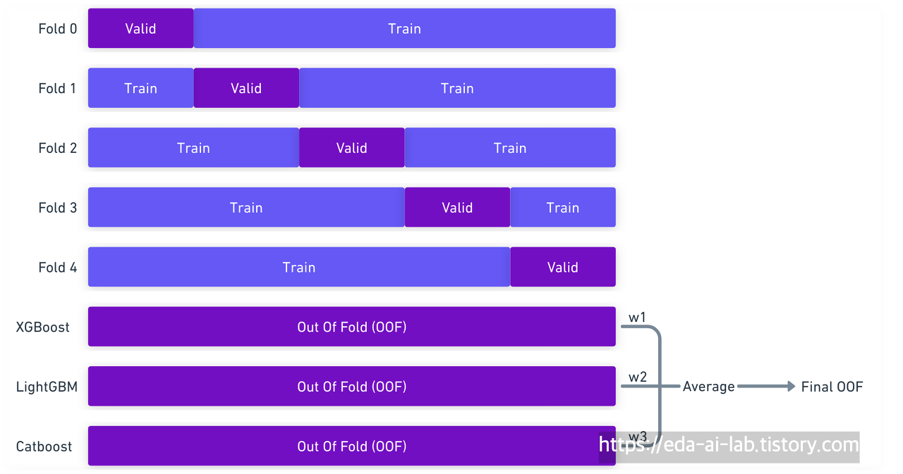 학습의 경우는 KFold와 결합해서 5 * 3 = 15개의 모델을 만들어서 사용할 수도 있고 Final OOF를 통해서 앙상블의 성능 검증을 진행하고, weight average의 경우 w의 값도 이를 통해 튜닝이 가능한 점 참고하시기 바랍니다. (w를 grid search나 하이퍼 파라미터의 튜닝 방법론을 통해 찾기도 합니다)